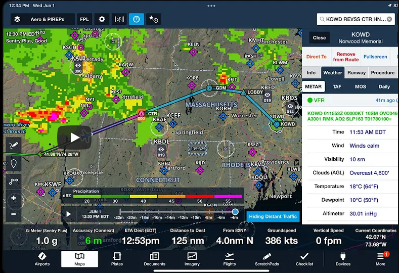 On the left, you can see Foreflight receiving ADSB weather radar data and depicting it on the moving map. Traffic targets received from ADSB would also depicted and color coded in the moving map depending on how far away from your airplane. Different data feeds from ADSB data stream is depicted as map layers and can be individually turned on and off depending on what the pilot wishes to see on the moving map. METARs, TAFs, and NOTAMs are displayed on each airport page, specific to that airport.